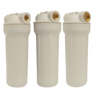 The flask for water filters is opaque, made of polypropylene, the lid is white with a brass threaded insert.