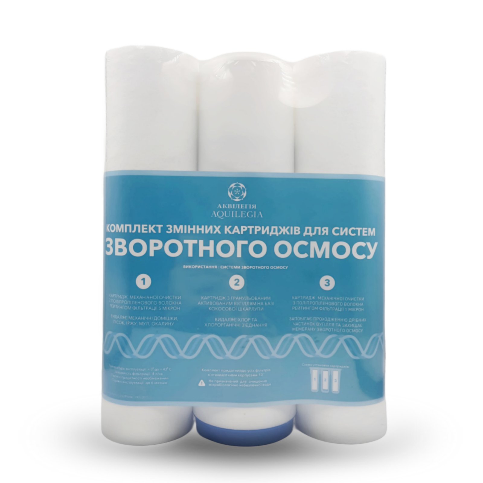 Комплект картриджів Аквілегія для систем зворотного осмосу – призначений для попереднього очищення води у системах зворотного осмосу. Очищення води в системах зворотного осмосу виконує напівпроникна мембрана, але якщо воду попередньо не очищати від великих механічних домішок і хлору, то термін її служби скоротиться.