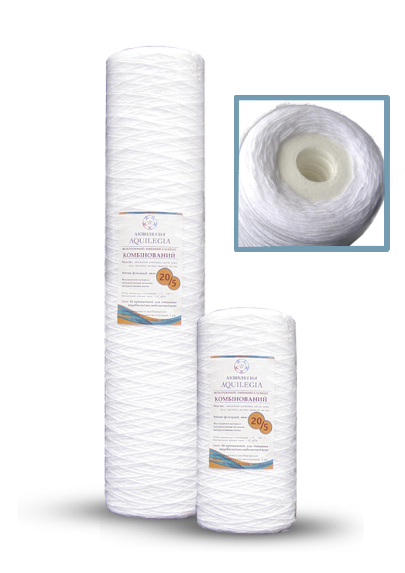 Двухградиентные картриджи для фильтров воды имеет мультикомпонентную структуру: на сердцевину из полипропиленового волокна, изготовленную методом пневмоэкструзии, навита полипропиленовая нить. Внутренняя сердцевина из полипропиленового волокна имеет обычно вдвое меньший рейтинг фильтрации, предотвращает смыв частиц из поверхностного фильтрующего слоя, навитого из полипропиленовой нити. Сам по себе внутренний слой имеет двухградиентый рейтинг фильтрации от 10 до 5 мкм. Поэтому данный комбинорованный картридж для фильтров воды имеет общий рейтинг фильтрации – 20/10/5 мкм. Задерживаемые частицы загрязнений равномерно распределяются снаружи внутрь по толще фильтрующему материалу, за счет чего обеспечивается повышенный ресурс картриджа для воды